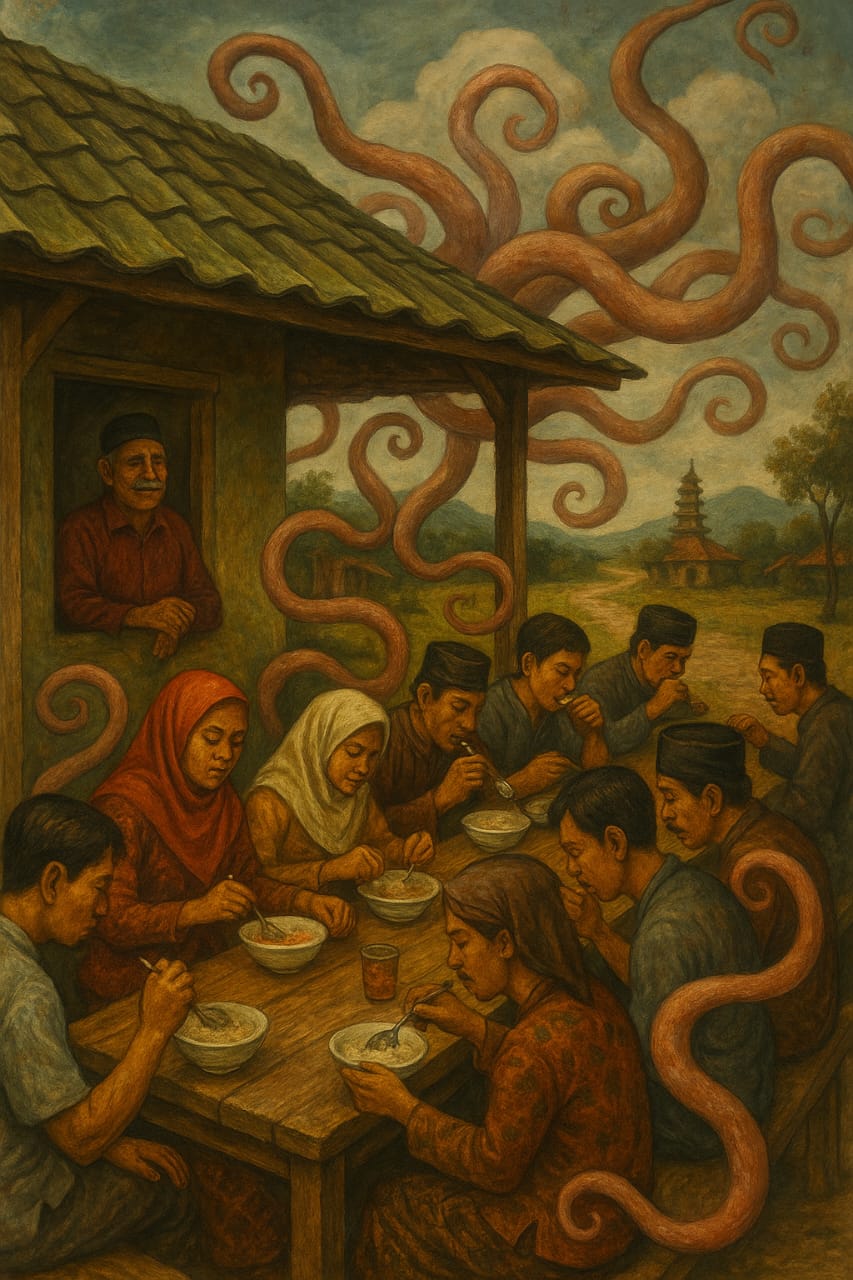 Isterinya cekatan meletakkan mangkok lain pada tempat biasa. Di meja itu hamparan lauk pauk lebih dari cukup. Jaka dengan lahap menghabiskan semangkok soto ditemani renyahnya tempe goreng bersama kerupuk udang. Sungguh nikmatnya menciptakan sensasi berbayang. Segelas teh manis hangat digelontorkan supaya alur tenggorokan lapang. Sendawa meletup di akhir. Napas panjang di hela untuk mengatur kenyamanan.