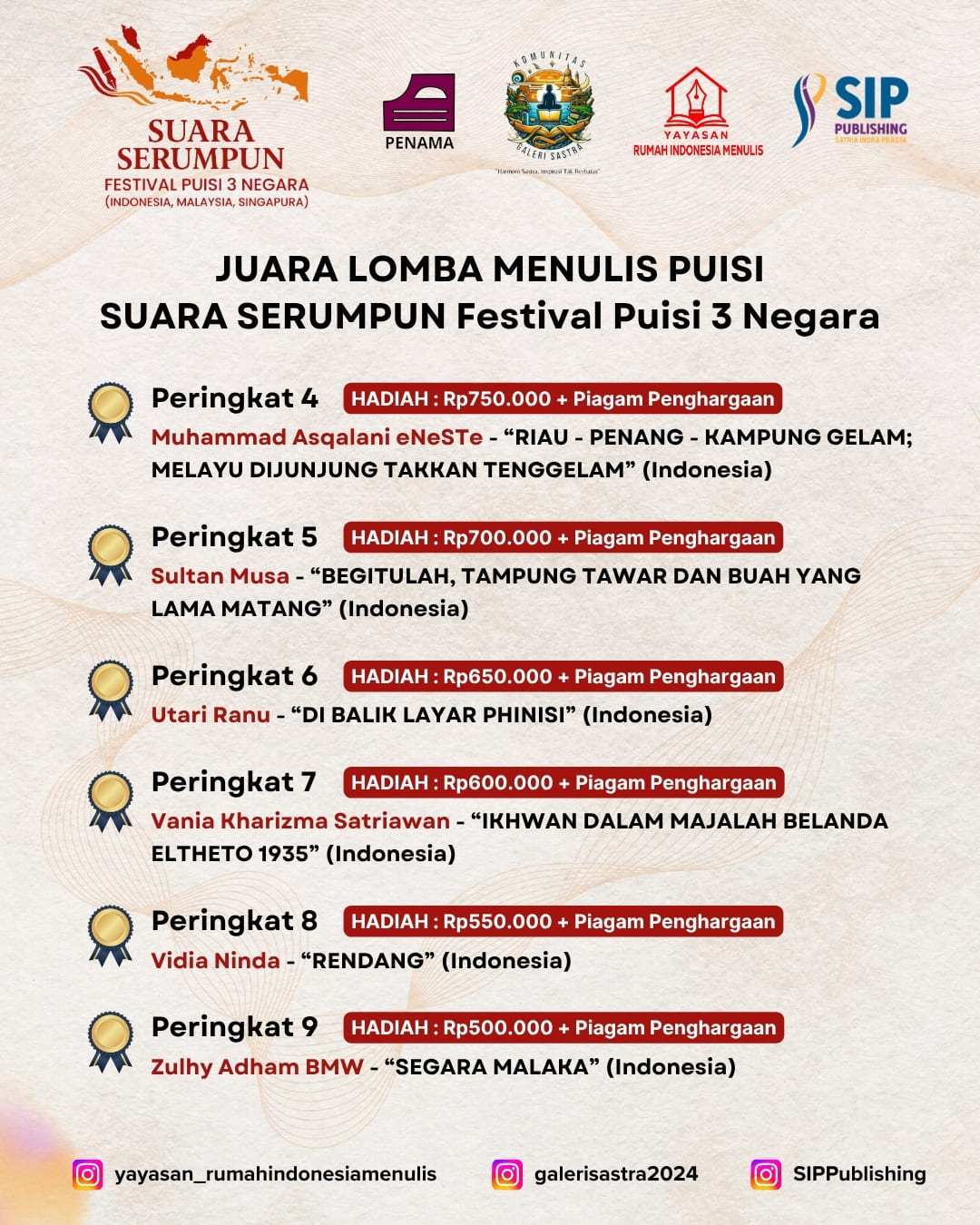 Panitia akan segera menghubungi para pemenang untuk proses pengiriman hadiah.