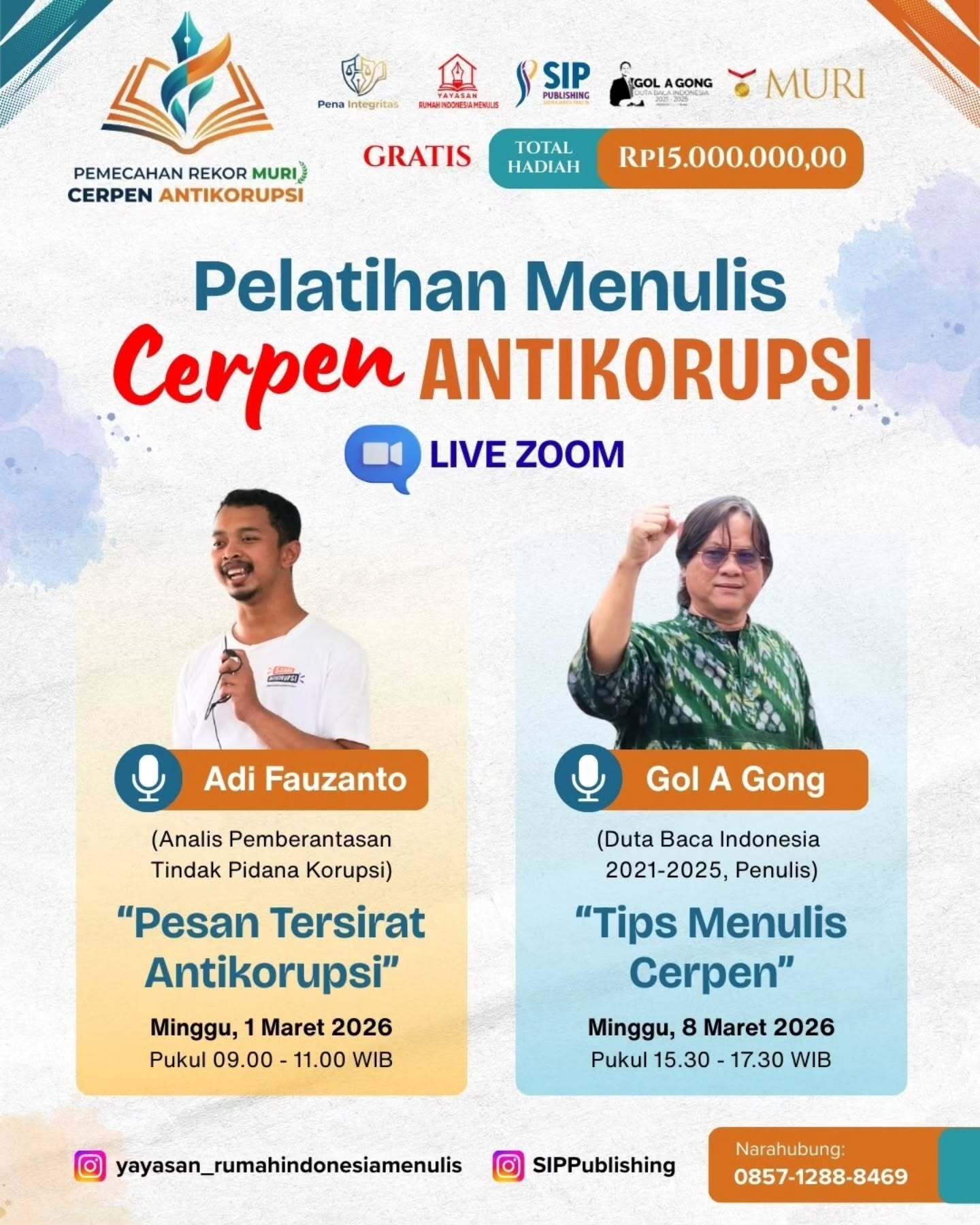 Inilah saatnya kekuatan kata-katamu berbicara. Yayasan Rumah Indonesia Menulis, S.I.P. Publishing, dan MURI mengundangmu untuk bergabung dalam gerakan Pemecahan Rekor MURI Menulis Cerpen Antikorupsi Terbanyak bersama Gol A Gong
