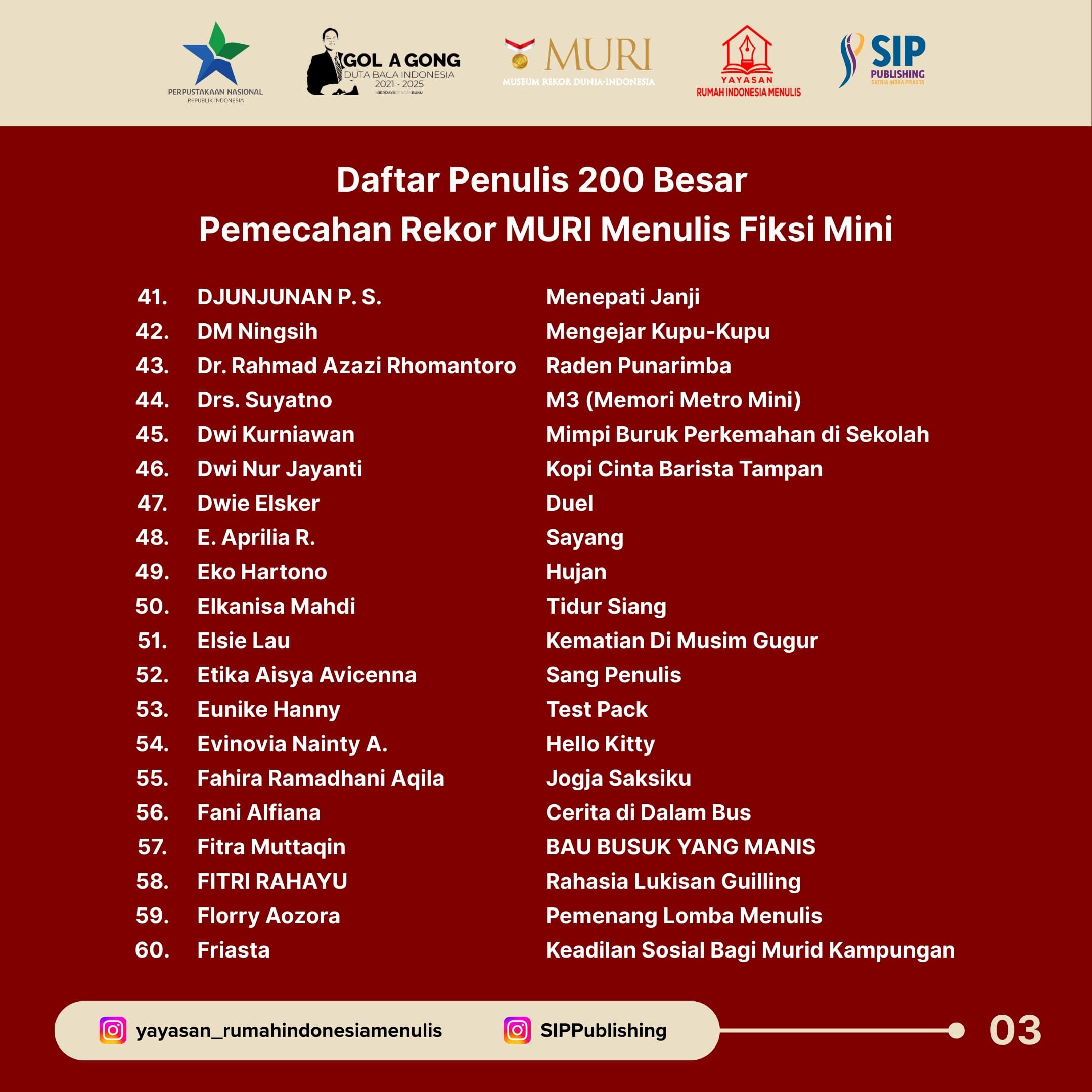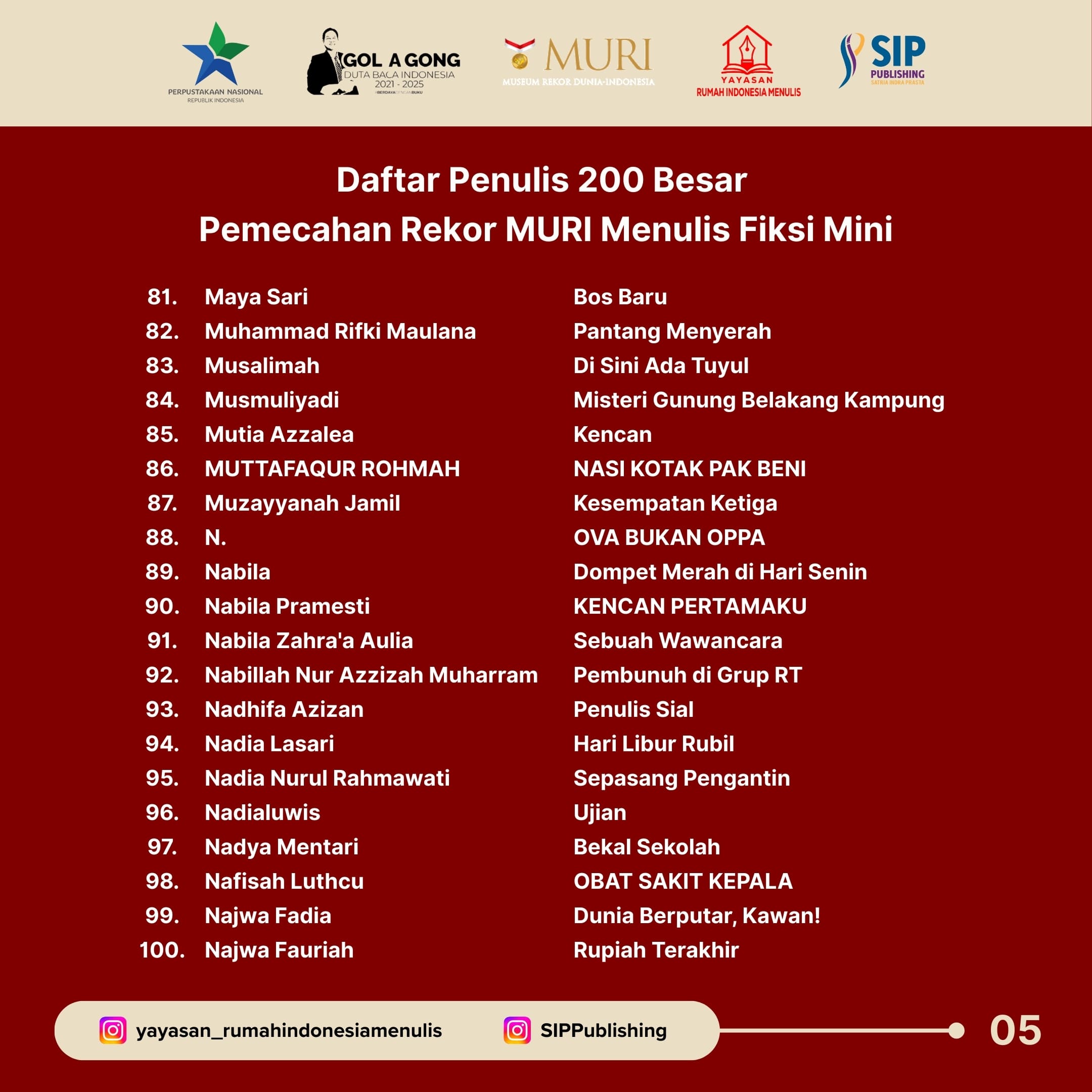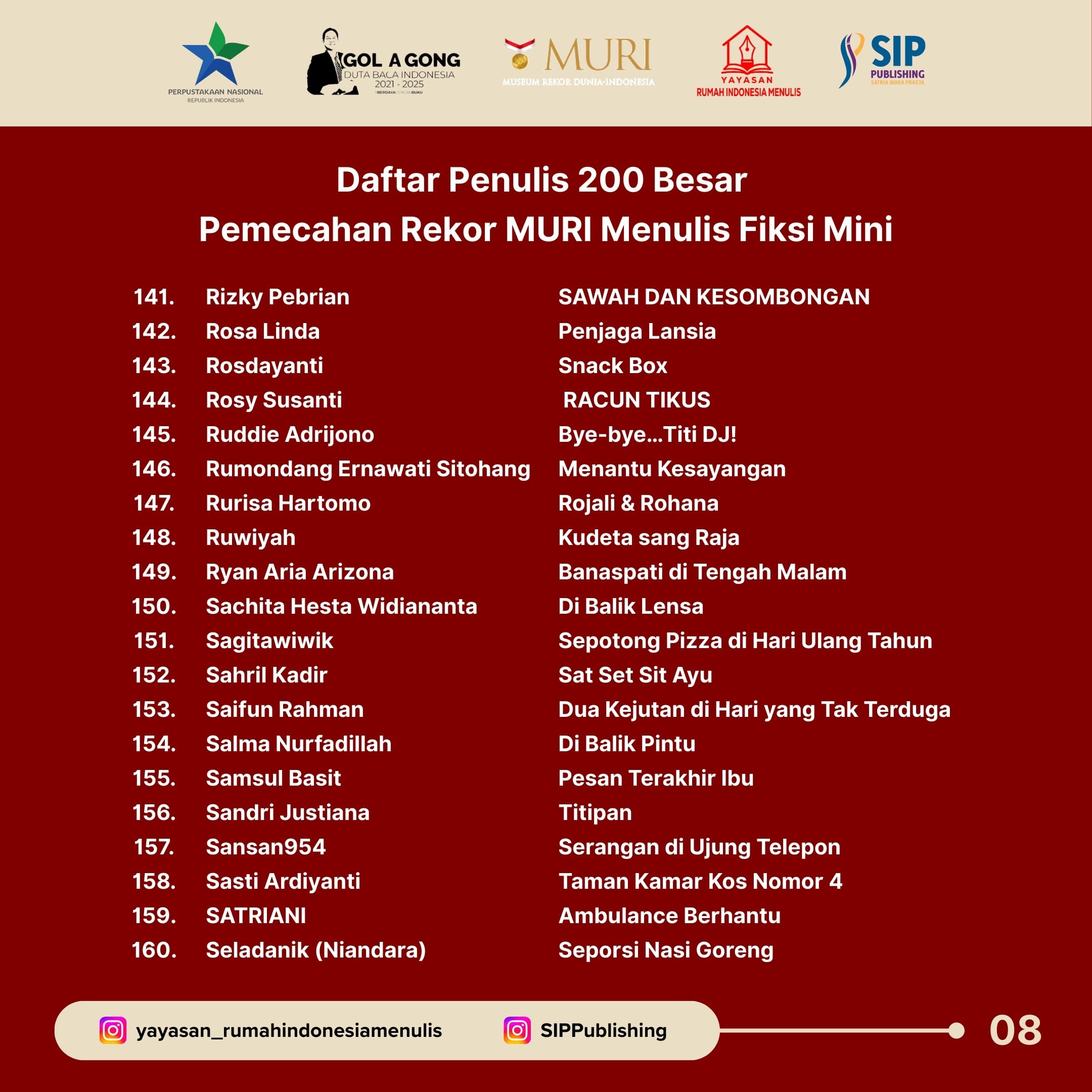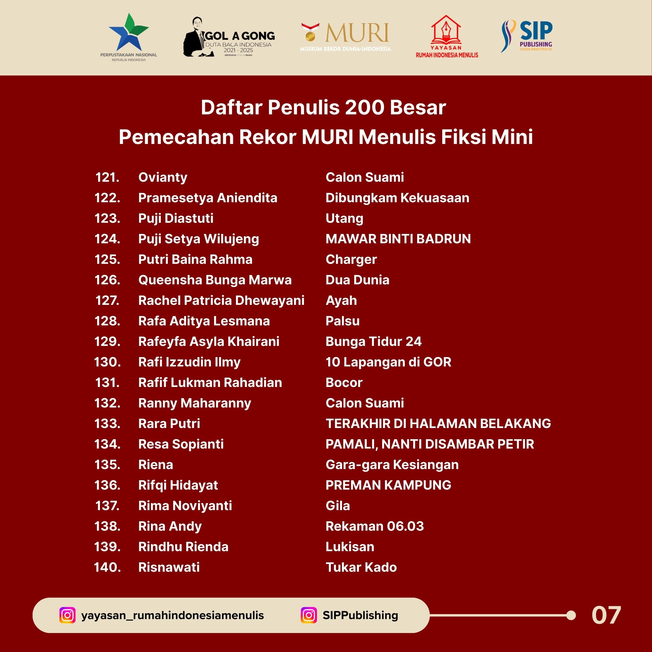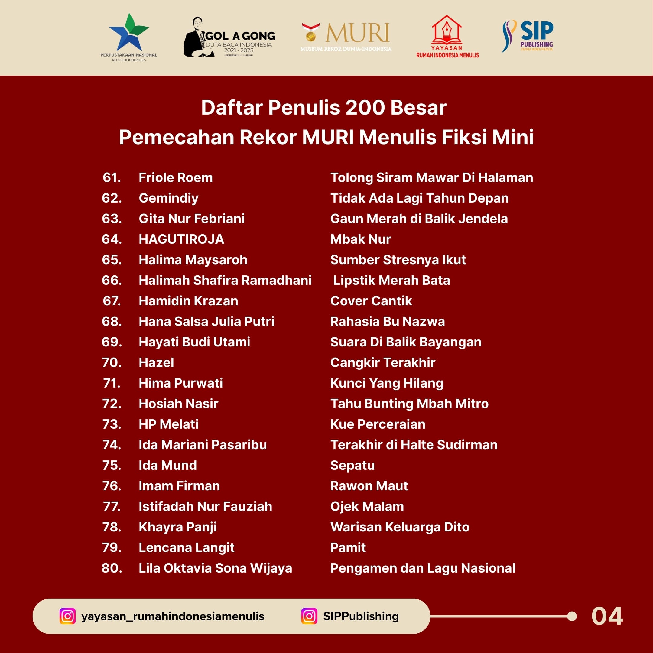 Daftar Penulis 200 Besar Pemecahan Rekor MURI Menulis Fiksi Mini