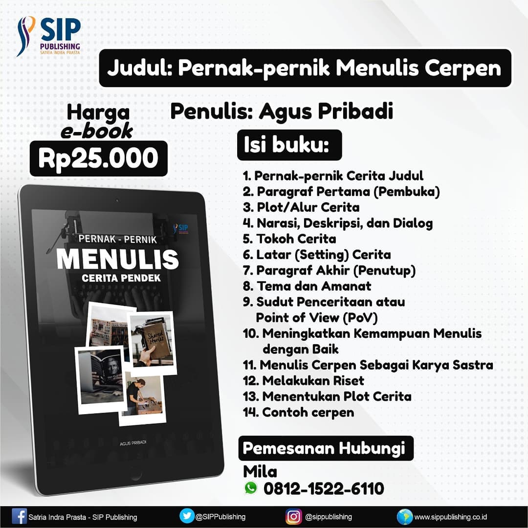 E-Book “Pernak-pernik Menulis Cerpen” Post Author:admin Post published:26/08/2021 Post Category:Info Terbaru Post Comments:0 Comments E-book yang berisikan kiat-kiat menulis cerpen ini sudah terjual lebih dari 300 copy Ada yang berminat? Silahkan bisa hubungi nomer yang tercantum di poster. Read more articles Previous PostPeluncuran dan Diskusi Buku Anak Cucu BonokelingNext PostE-Book “Retisalya” Untaian Lara Hati You Might Also Like FESTIVAL CERPEN INDONESIA 2025 Total Hadiah Rp15.000.000,00 02/11/2025 Buku Terbitan SIP Publishing di “Festival Pelajar” Wonosobo 27/05/2023 Daftar Peserta Lolos Kurasi Kelas Puisi bersama Ratna Ayu Tema Ziarah Cinta 21/02/2025 Leave a Reply Cancel replyCommentEnter your name or username Enter your email Enter your website URL (optional)