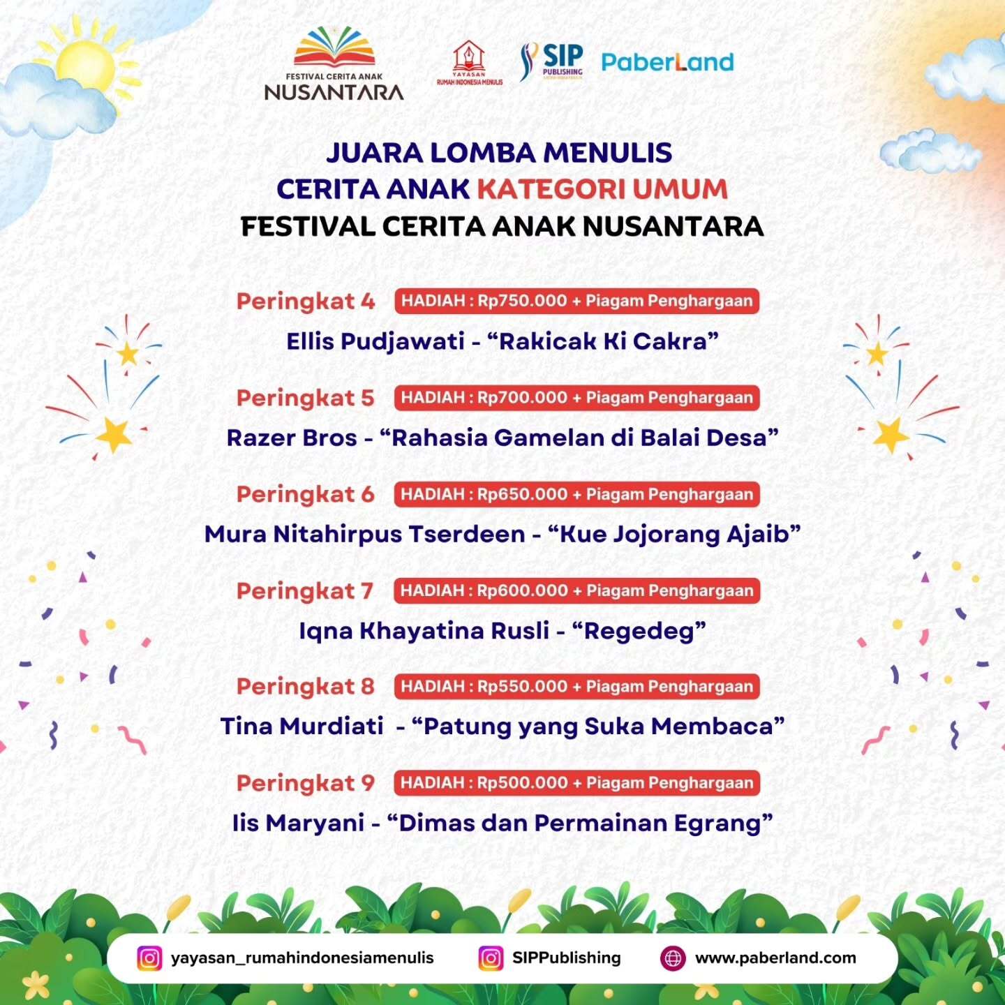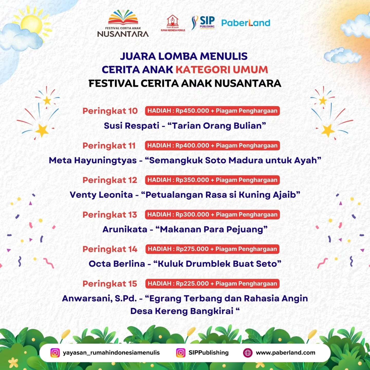 Juara Lomba Menulis Cerita Anak Kategori Umum Festival Cerita Anak Nusantara 2025 Post Author:admin Post published:18/11/2025 Post Category:Info Terbaru / Kelas Menulis / Lomba Post Comments:0 Comments Kami ucapkan selamat kepada para pemenang lomba menulis cerita anak kategori umum dalam rangka Festival Cerita Anak Nusantara 2025 Para pemenang akan dihubungi oleh panitia untuk proses pengiriman hadiah. Read more articles Previous Post30 Besar Lomba Read Aloud Festival Cerita Anak NusantaraNext PostJuara Lomba Menulis Cerita Anak Kategori Usia 7-13 Tahun Festival Cerita Anak Nusantara 2025 You Might Also Like Ruang LiteraSIP Edisi #39 Minggu, 8 Oktober 2023 09/10/2023 Kunjungan Tim SEAMEO QITEP in Language Jakarta Selatan 21/10/2024 Ruang LiteraSIP Edisi #31 13/08/2023 Leave a Reply Cancel replyCommentEnter your name or username Enter your email Enter your website URL (optional)