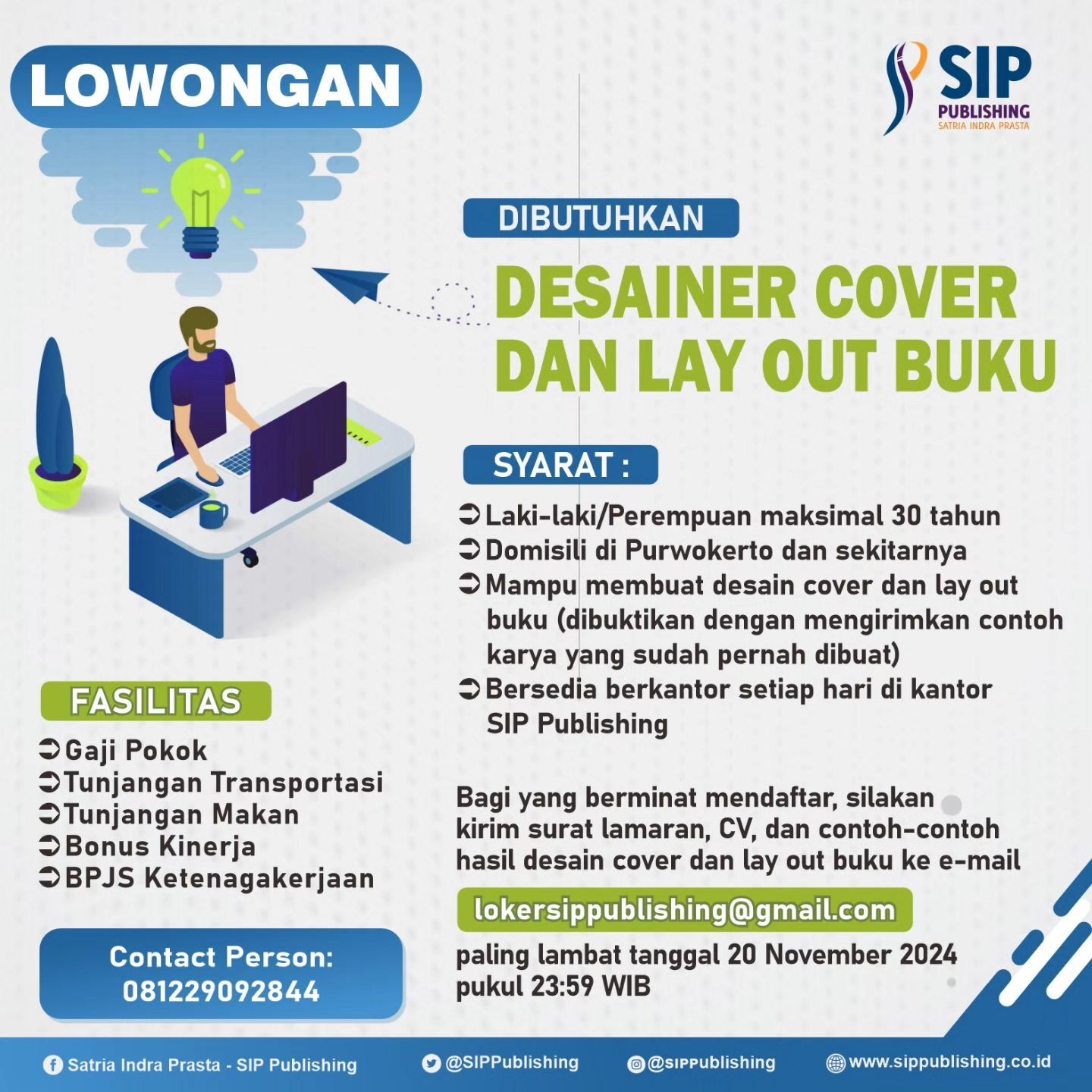 Lowongan Desainer Cover dan Lay Out Buku Post Author:admin Post published:08/11/2024 Post Category:Info Terbaru Post Comments:0 Comments Yang mau gabung dengan kami silakan bisa kirim lamaran. Full time. Wajib ngantor. Read more articles Previous PostKelas Menulis Puisi Angkatan 22Next PostPengumuman Pemenang Pelatihan dan Lomba Menulis Cerita Anak Tema Permainan Tradisional You Might Also Like Hari ke-4 Kegiatan Duta Baca Indonesia bersama SIP Publishing 22/12/2022 Pelatihan Menulis Fiksi Mini November 2023 19/11/2023 Pengumuman Giveaway Periode Januari 2023 01/02/2023 Leave a Reply Cancel replyCommentEnter your name or username Enter your email Enter your website URL (optional)