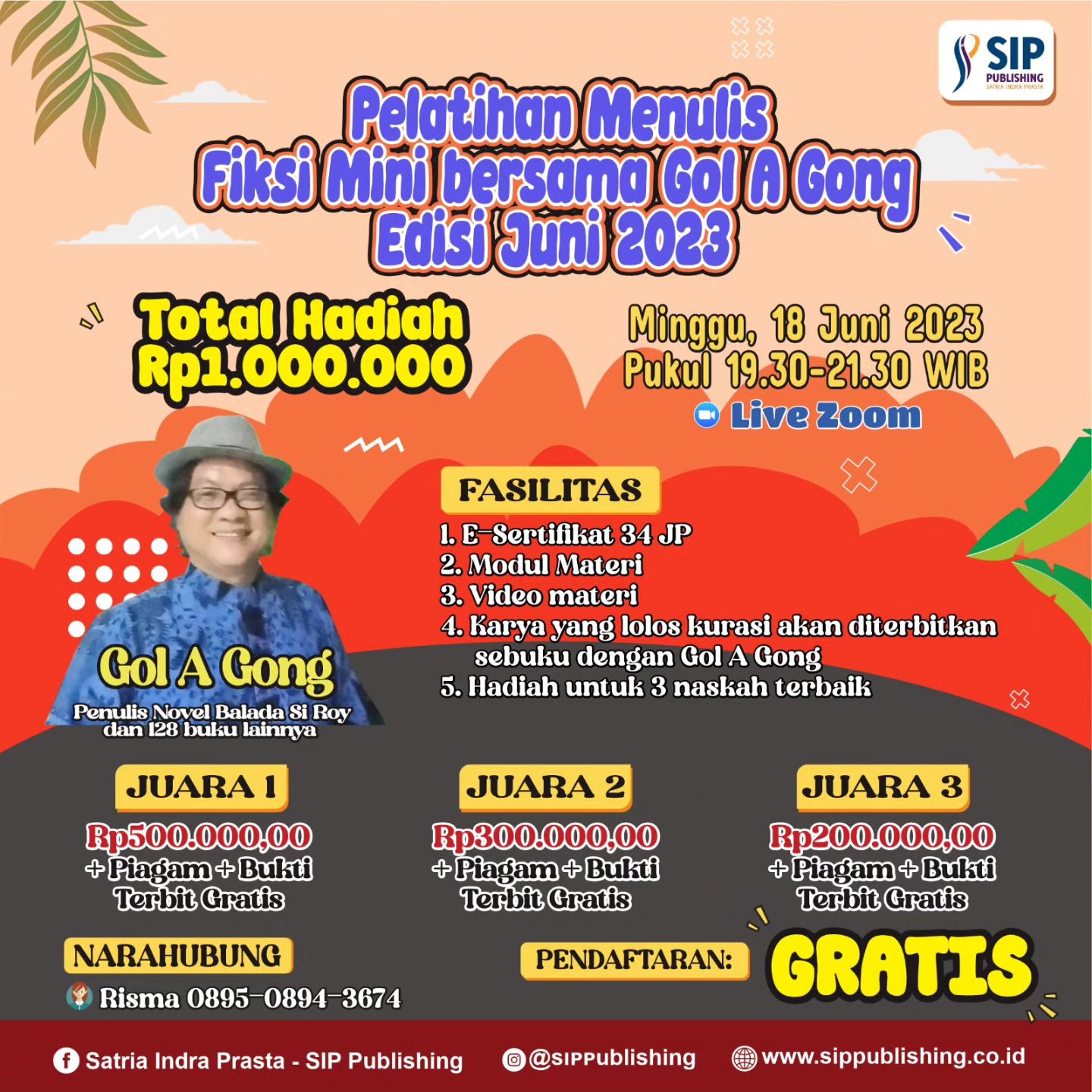 Dengan pendaftaran yang GRATIS, dapatkan fasilitas berupa E-sertifikat 34 JP, modul materi, video materi, karya yang lolos kurasi akan diterbitkan sebuku dengan Gol A Gong, dan juga ada hadiah total Rp1.000.000,00