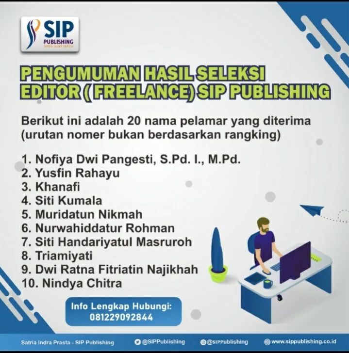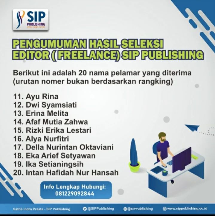Pengumuman Hasil Seleksi Editor Freelance Post Author:admin Post published:18/10/2022 Post Category:Info Terbaru Post Comments:0 Comments Kami ucapkan selamat bagi para pelamar yang lulus seleksi Selanjutnya akan dihubungi oleh kami untuk melakukan kontrak kerja. Read more articles Previous PostPELATIHAN MENULIS FIKSI MINI BERSAMA DUTA BACA INDONESIANext PostPelatihan Bersama Duta Baca Indonesia di Bulan Oktober You Might Also Like Rapat Karyawan SIP Publishing bulan April di Hotel Luminor Purwokerto 17/05/2023 Ruang LiteraSIP Edisi #56 04/02/2024 Pengumuman Naskah Lolos Kurasi Dongeng tentang Sepatu, Tas, dan Mainanku 17/10/2023 Leave a Reply Cancel replyCommentEnter your name or username Enter your email Enter your website URL (optional)