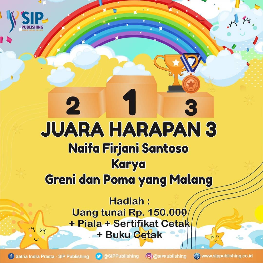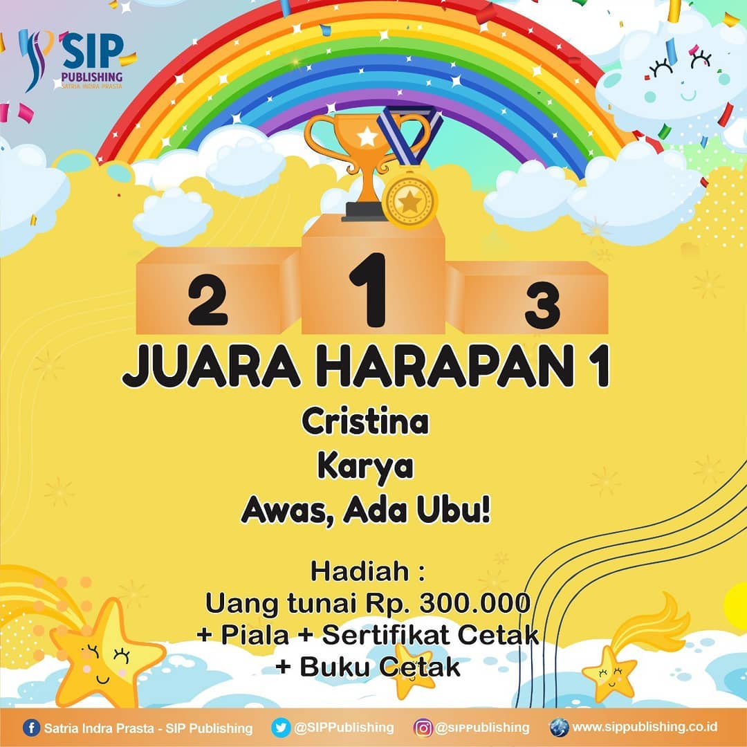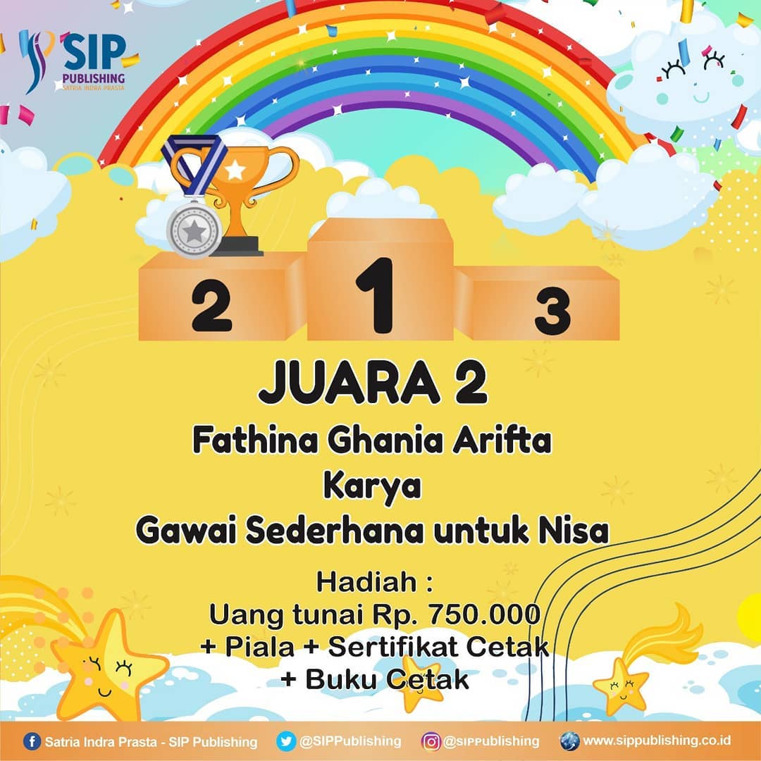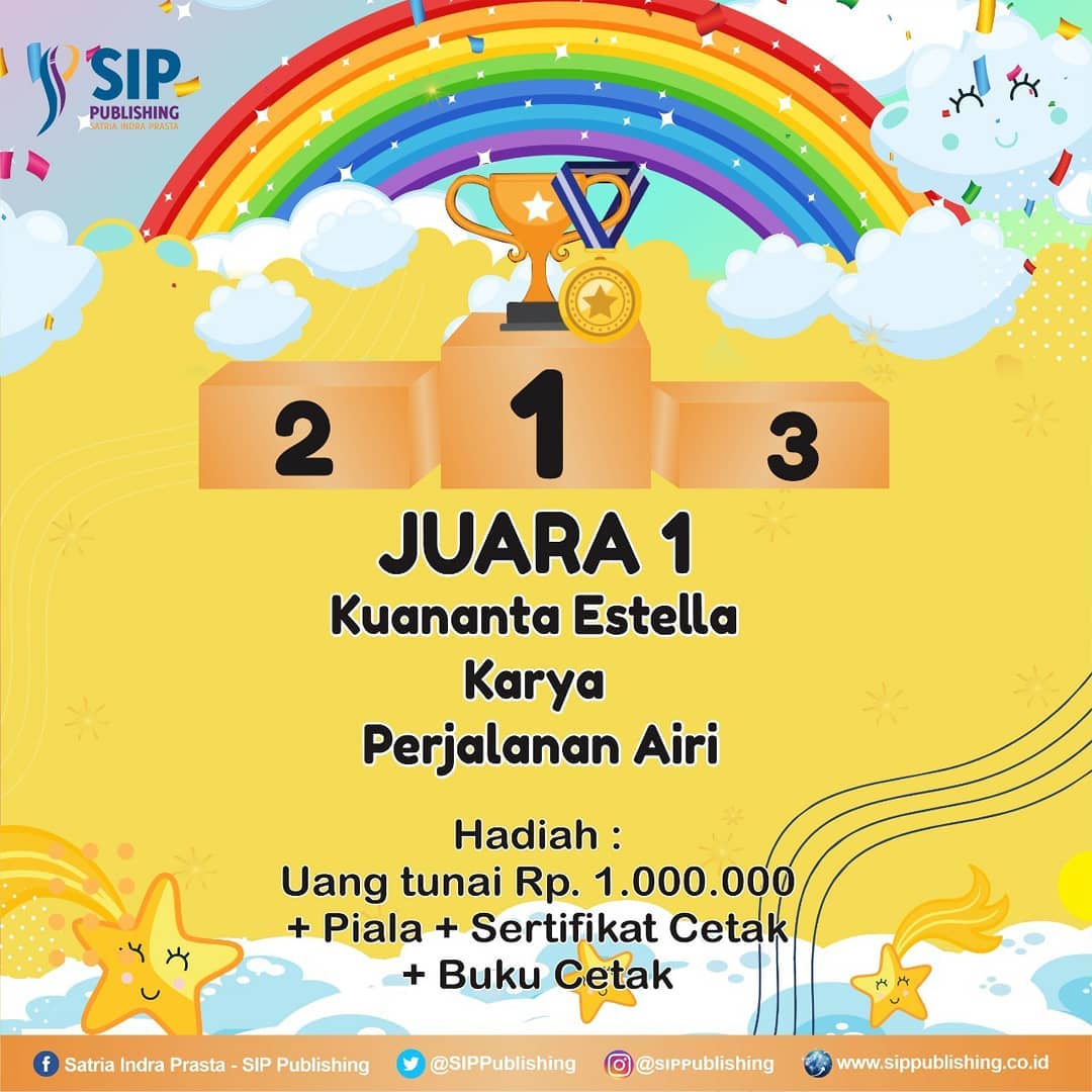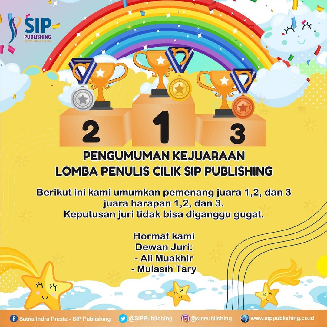 Pengumuman Juara Lomba Penulis Cilik Indonesia Post Author:admin Post published:06/05/2021 Post Category:Info Terbaru / Lomba Post Comments:0 Comments Selamat untuk semua pemenang. Selanjutnya para pemenang dan juga penulis yang masuk 30 besar akan dimasukkan dalam grup WA. Teknis pembagian hadiah dan sertifikat akan dijelaskan di grup. Read more articles Previous PostPengumuman 30 Besar Lomba Penulis Cilik IndonesiaNext PostKatalog SIP Publishing April 2021 You Might Also Like JAGUNG BOSE, MOKO DAN TARIAN LEGO-LEGO – Kumpulan Cerita Anak Tema Liburan 07/09/2024 3 Naskah Terbaik “15 Hari Nulis Cerpen Bareng Agus Pribadi” 03/11/2020 Peluncuran dan Diskusi Buku Anak Cucu Bonokeling 25/08/2021 Leave a Reply Cancel replyCommentEnter your name or username Enter your email Enter your website URL (optional)