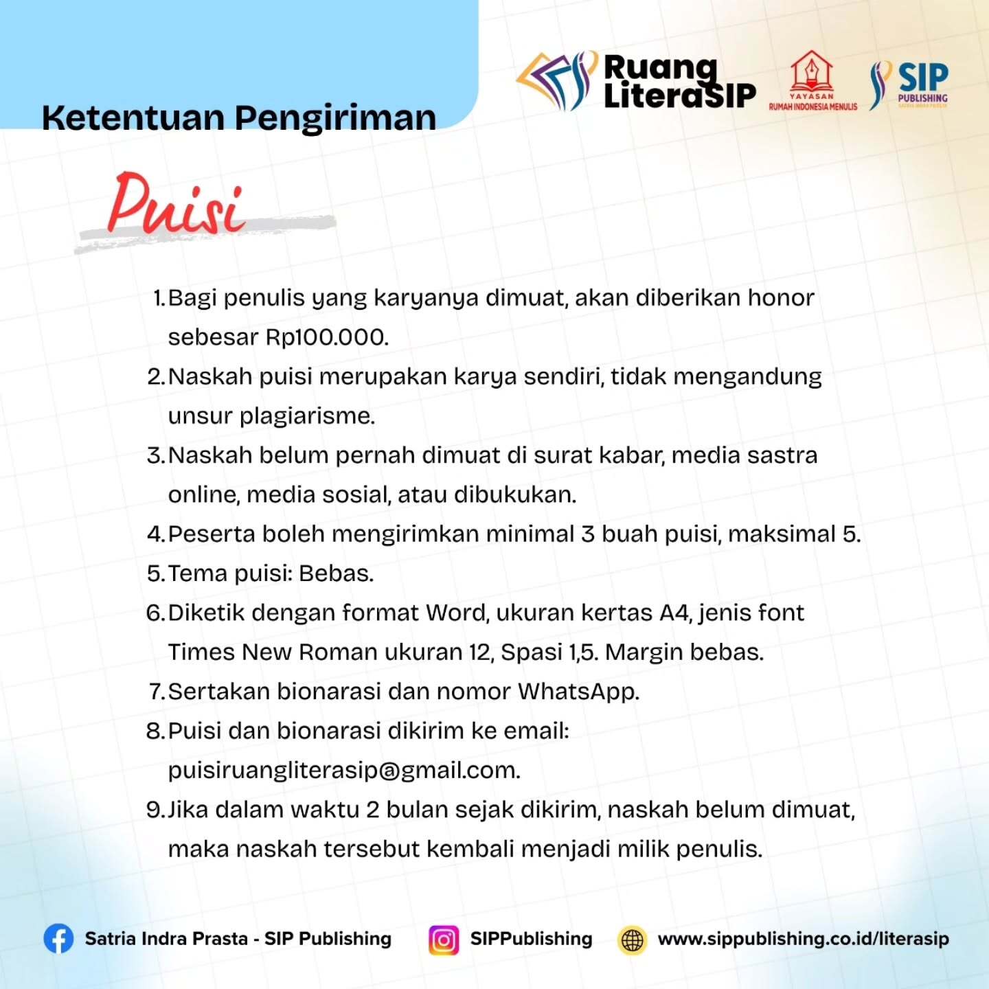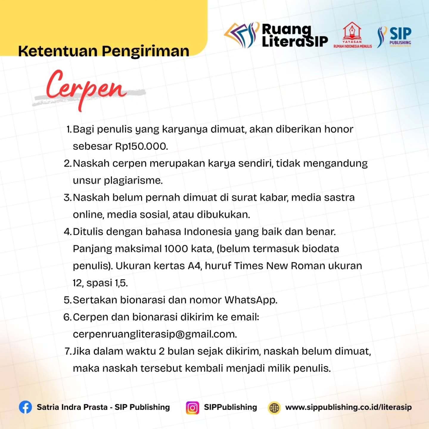 Ruang LiteraSIP memberikan honor Rp150.000 bagi penulis cerpen dan Rp100.000 bagi penulis puisi yang dimuat setiap minggunya